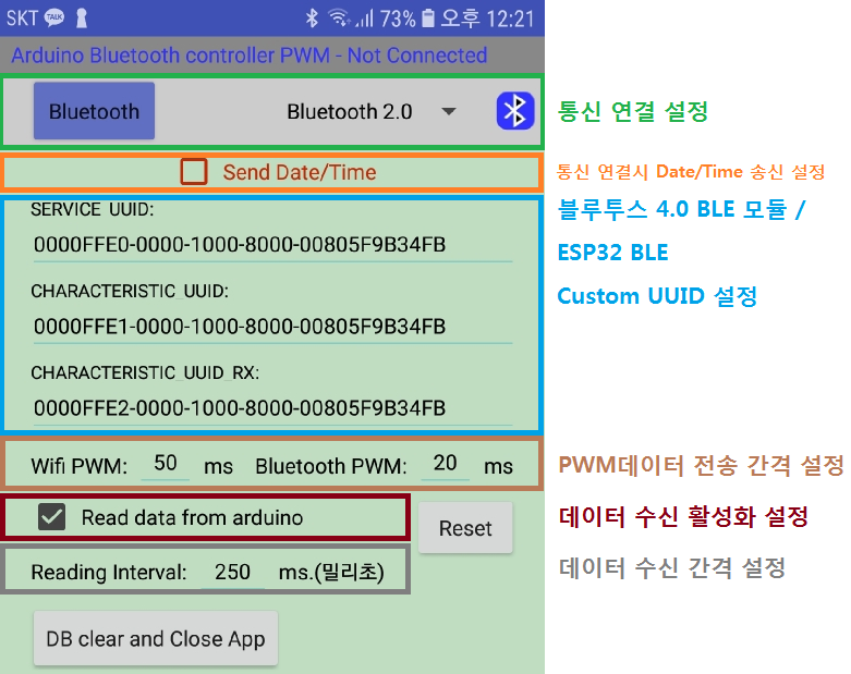 SERVICE UUID : Bluetooth 4.0 BLE의 Custom UUID를 설정할 수 있습니다.